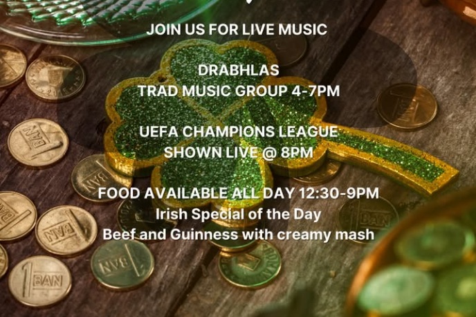 We are open in the bar and restaurant this St Patrick’s day from 12:30 till 11PMJoin us for what’s bound to be a brilliant day with an amazing trad band, live football and lots of delicious food and drinks.
